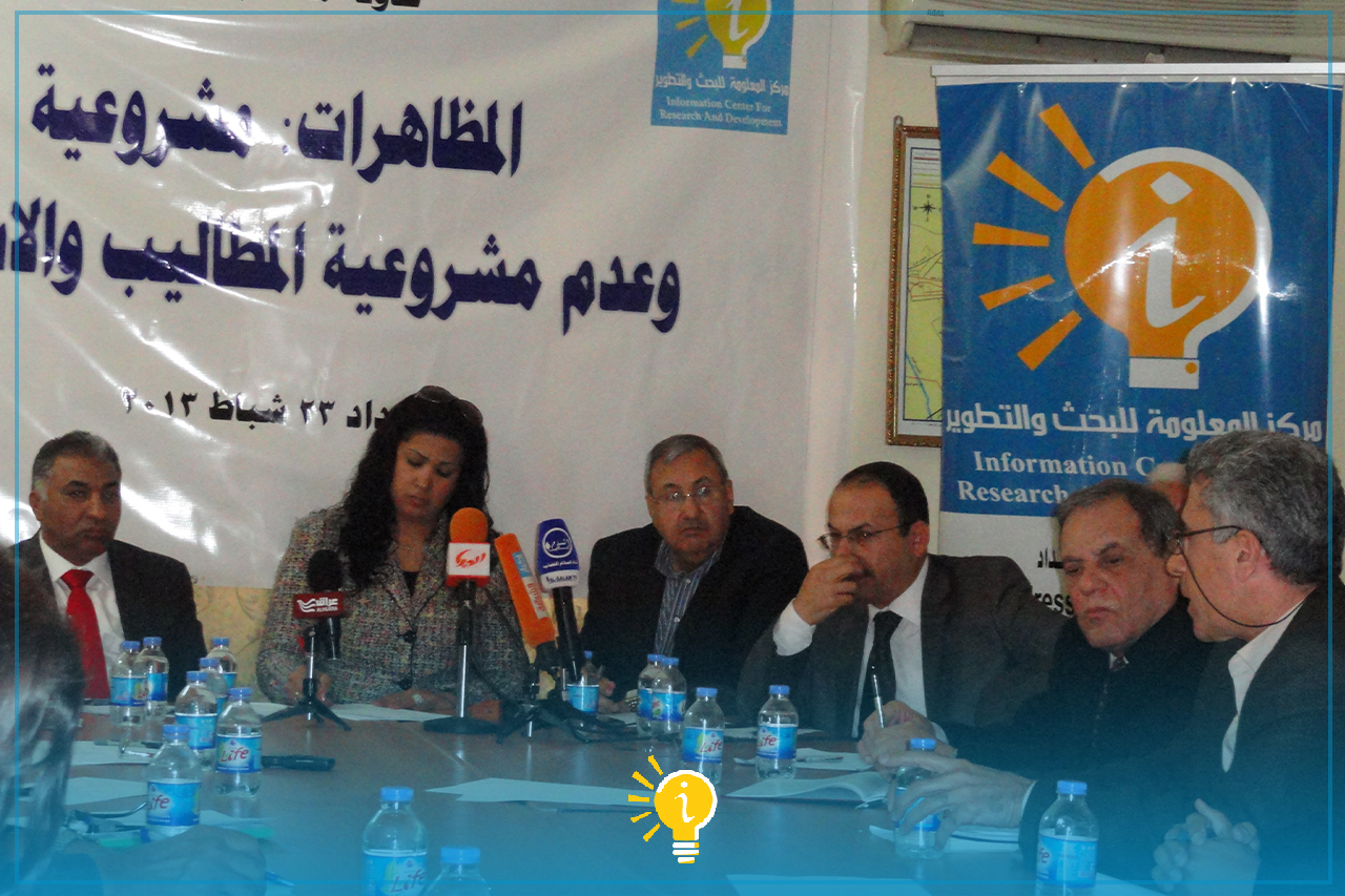 بحضور حشد من الاساتذة الجامعيين والنشطاء المدنيين والسياسيين والمهتمين بالشأن السياسي والتظاهرات الجارية في العراق، فضلا عن الاعلاميين، عقد مركز المعلومة للبحث والتطوير بالتعاون مع المجلس العراقي للسلم والتضامن، طاولة مستديرة حول التظاهرات مشروعية وعدم مشروعية المطاليب والاساليب، يوم السبت المصادف 23/2/2013 وعلى قاعة المجلس.
