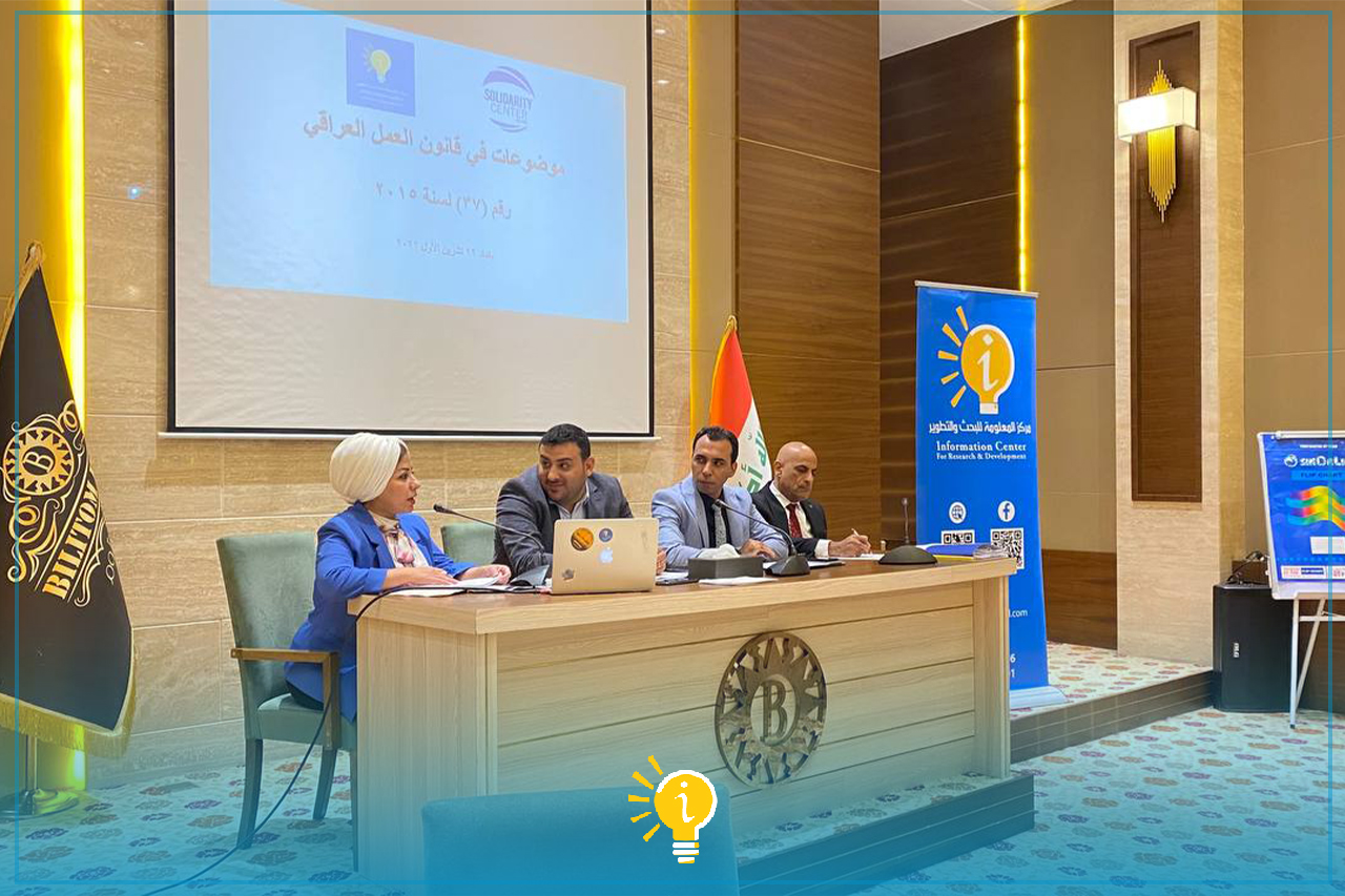 نظم مركز المعلومة للبحث والتطوير، وبدعم من مركز التضامن العمالي، مؤتمرا أكاديميا للبحوث المتعلقة بقانون العمل النافذ رقم (٣٧) السنة ٢٠١٥، بحضور حشد من ممثلي وزارة العمل والشؤون الاجتماعية – دائرة العمل والتدريب المهني، وممثلي نقابات العمال ومنظمات أصحاب العمل، فضلا عن منظمات مجتمع مدني ومهتمين. وذلك يوم السبت الموافق ٢٢ نشرين الأول ٢٠٢٢، في بغداد.